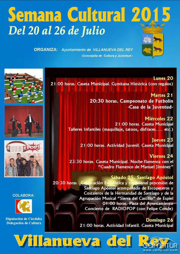 La Concejalía de Cultura y Juventud del Ayuntamiento de Villanueva del Rey, en colaboración con la Diputación de Córdoba y la Delegación de Cultura de Córdoba, organizan la Semana Cultural 2015 del 20 al 26 de julio en Villanueva del Rey.